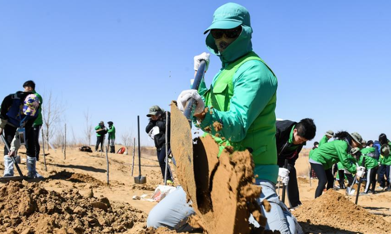當(dāng)日,200余名中韓兩國青年志愿者來到內(nèi)蒙古自治區(qū)達(dá)拉特旗庫布其沙漠種樹。