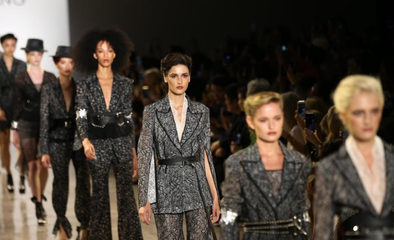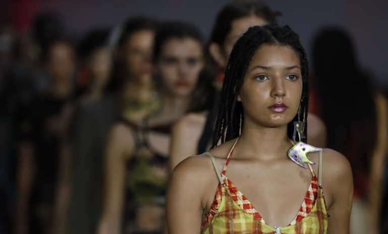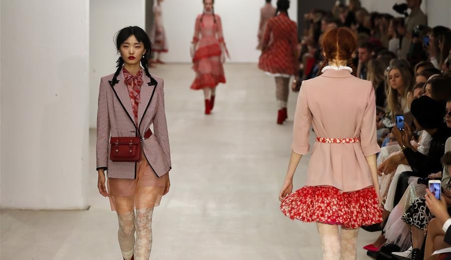 9月17日,在英國倫敦,模特在2020倫敦春夏時(shí)裝周上展示Charlotte Knowles品牌服飾(多重曝光)。