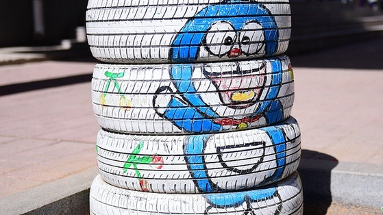 5月4日,二十余個(gè)印有卡通圖案及奧運(yùn)五環(huán)造型等創(chuàng)意輪胎花盆亮相沈陽(yáng),吸引市民。多啦A夢(mèng)卡通輪胎