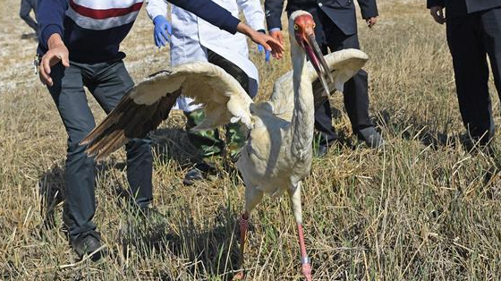 當(dāng)日,在吉林省莫莫格國(guó)家級(jí)自然保護(hù)區(qū),江西省野生動(dòng)植物救護(hù)繁育中心工作人員將一只在江西鄱陽(yáng)湖區(qū)“落單”的小白鶴放飛野外。