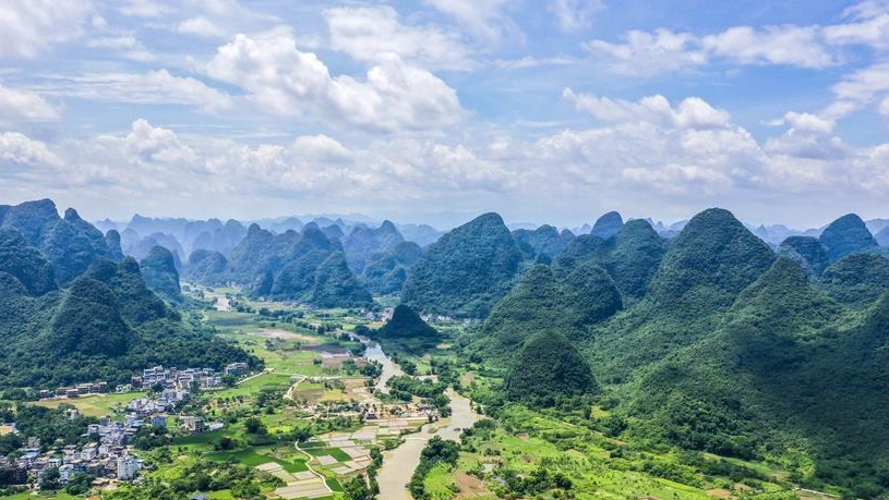 時值夏日,廣西桂林市陽朔縣景色宜人,青山綠草、藍天白云構成一幅幅美麗的山水畫卷。