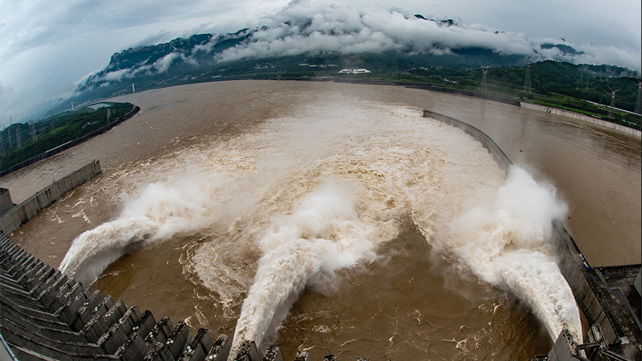 2020年7月2日,湖北宜昌,長(zhǎng)江三峽樞紐開啟泄洪深孔泄洪。