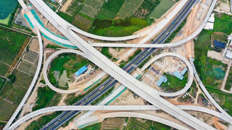 這是已經(jīng)建設(shè)完成的潮汕環(huán)線高速公路上北互通立交,沈海高速公路從該互通立交下面穿過(無人機照片,7月31日攝)。