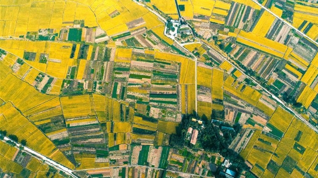 近日,位于太行山下的河北省涉縣白芟村上千畝水稻逐漸成熟。從空中俯瞰,猶如一塊塊“調(diào)色盤(pán)”,美不勝收。