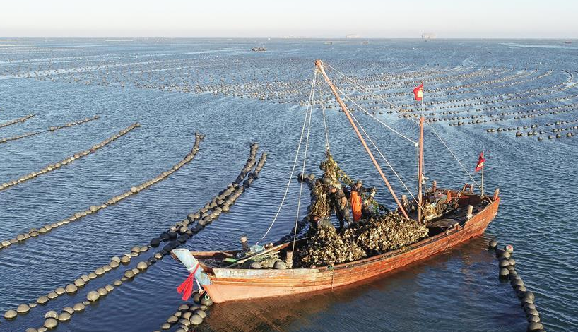 當(dāng)日,在遼寧省大連市長??h廣鹿島海域,漁民忙碌地打撈牡蠣,呈現(xiàn)一片繁忙的豐收景象。