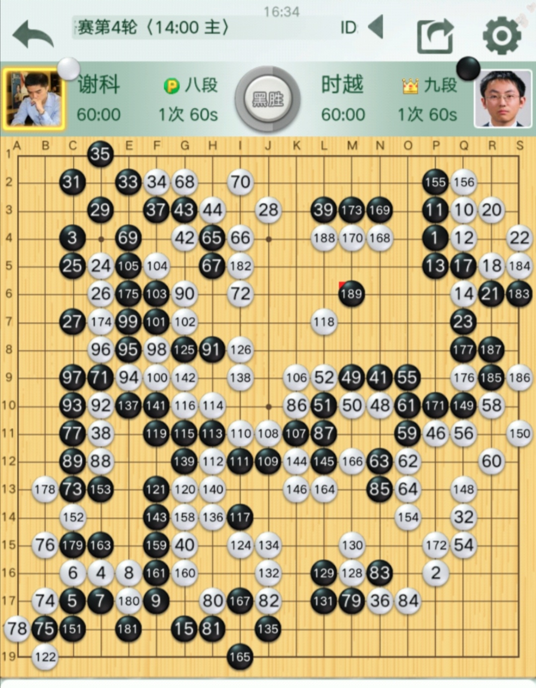 第二臺(tái)主將之戰(zhàn)謝科八段VS時(shí)越九段(對(duì)陣棋譜),時(shí)越最后勝出。時(shí)越首輪逆襲勝排名第二的楊鼎新九段,本輪再度逆襲得手,倒春寒味道十足。白棋耗費(fèi)心力經(jīng)營中腹,但因黑棋在邊空所得更大,白棋大模樣作戰(zhàn)失敗。之后黑棋守牢己方大空,相機(jī)壓縮白棋中腹模樣,白棋實(shí)空“干不夠”,直至認(rèn)輸。