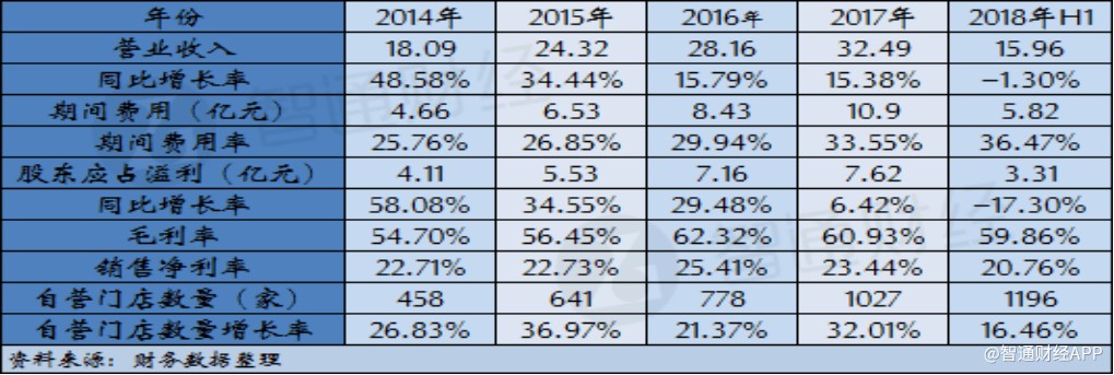 根據(jù)智通財(cái)經(jīng)APP的梳理,周黑鴨自營門店數(shù)量在2014年為458家,此后三年公司自營門店數(shù)量每年都有超過20%的增長,但期間公司營業(yè)收入增幅卻呈現(xiàn)放緩的趨勢。與此同時,公司門店數(shù)量的增長也帶來費(fèi)用率逐年提升,截至2017年,公司期間費(fèi)用率達(dá)到33.55%,以至于公司凈利潤增速同比下滑超過23個百分點(diǎn)。公司2018年中期財(cái)報顯示,上半年公司門店數(shù)量凈增長169家,較2017年增長16.46%,門店數(shù)量快速增長的勢頭雖然的已延續(xù),但卻支撐不起公司營收繼續(xù)保持增長,同時公司期間費(fèi)用率進(jìn)一步提升至36.47%,導(dǎo)致盈利水平大幅下滑。