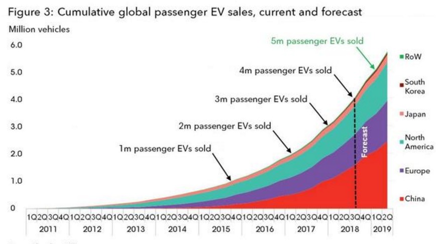 預(yù)計(jì)全球電動(dòng)車(chē)?yán)塾?jì)銷(xiāo)量突破500萬(wàn)僅需6個(gè)月時(shí)間,即到2019年3月份。未來(lái)電動(dòng)車(chē)銷(xiāo)量的增長(zhǎng)約42%的份額將會(huì)來(lái)自中國(guó)市場(chǎng),而歐洲和北美則將分別貢獻(xiàn)26%和25%。(林淼)