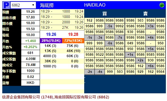 智通財(cái)經(jīng)APP獲悉,海底撈(03690)將于9月26日掛牌,上市前夕,據(jù)輝立交易場(chǎng)資料顯示,暗盤收?qǐng)?bào)19.26元,較招股價(jià)17.80元漲1.46元,漲8.20%。每手1000股,不計(jì)手續(xù)費(fèi),每手賺1460元。(文文)