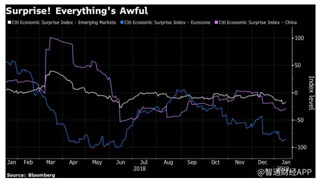 兩位分析師表示,歐洲和新興市場的經(jīng)濟(jì)驚喜指數(shù)均陷入負(fù)值區(qū)間。而標(biāo)普500指數(shù)成份股公司約有三分之一的營收來自海外,海外市場的進(jìn)一步疲軟可能最終會(huì)令美國國內(nèi)的增長前景變得黯淡。此外,美國國內(nèi)的經(jīng)濟(jì)增長前景在一定程度上也已經(jīng)因美國政府部分關(guān)門而減弱。