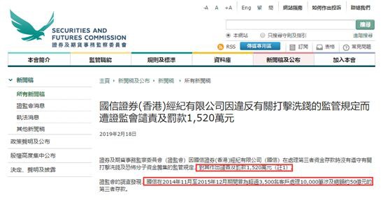 香港證監(jiān)會調(diào)查發(fā)現(xiàn),國信證券在2014年11月至2015年12月期間曾為超過3500名客戶處理10000筆涉及總額約50億港元的第三者存款。監(jiān)管特別指出,國信于為期14個月的期間,處理了超過2200筆可疑的第三者存款,涉及總額超過23億港元。