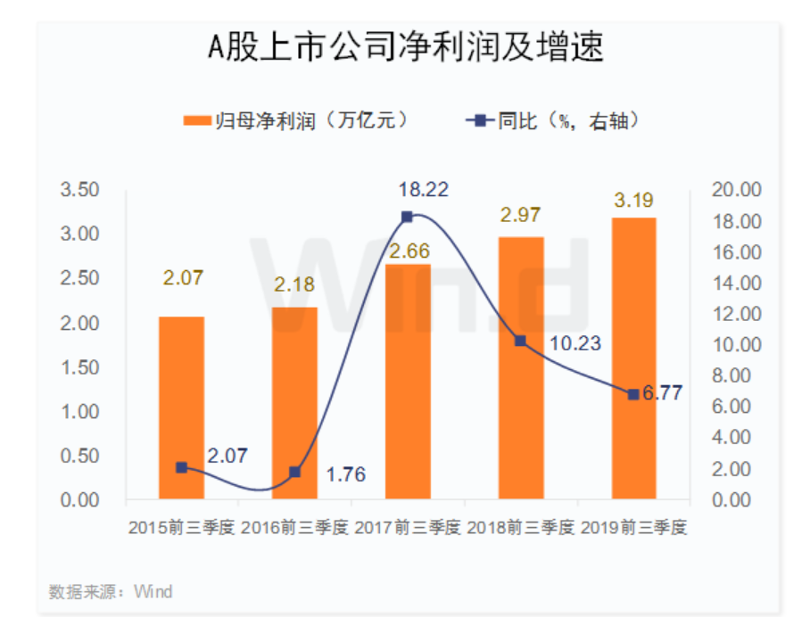2019年前三季度A股上市公司合計實現(xiàn)營業(yè)總收入35.83萬億元,同比增長8.65%;實現(xiàn)凈利潤(備注:以下統(tǒng)計均為歸屬母公司凈利潤)3.19萬億元,同比增長6.77%。