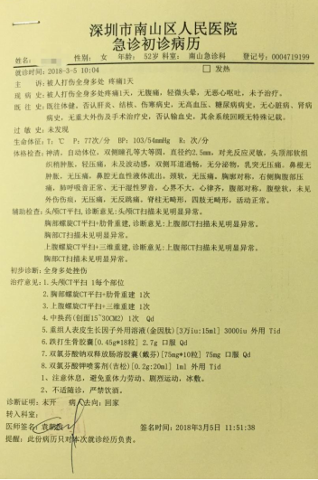 第二天,張女士立刻去深圳市南山區(qū)人民醫(yī)院急診科就診,初步診斷為“全身多處挫傷”。羅小姐說,“當時的法醫(yī)鑒定結(jié)果是輕微傷,法醫(yī)鑒定貼好封條交給了派出所。”