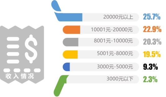 本次調(diào)研中,公司管理人員的比例最高,為19.4%,其次是公司一般職員,占比為18.4%;68.9%的受訪者其個人月收入超過8000元。