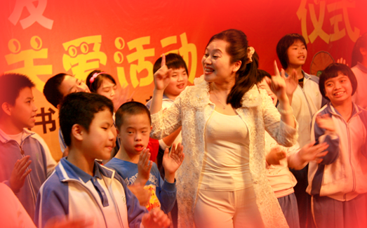 十年堅持義務為盲童教唱的愛心藝術(shù)家鄭海燕與盲童在一起