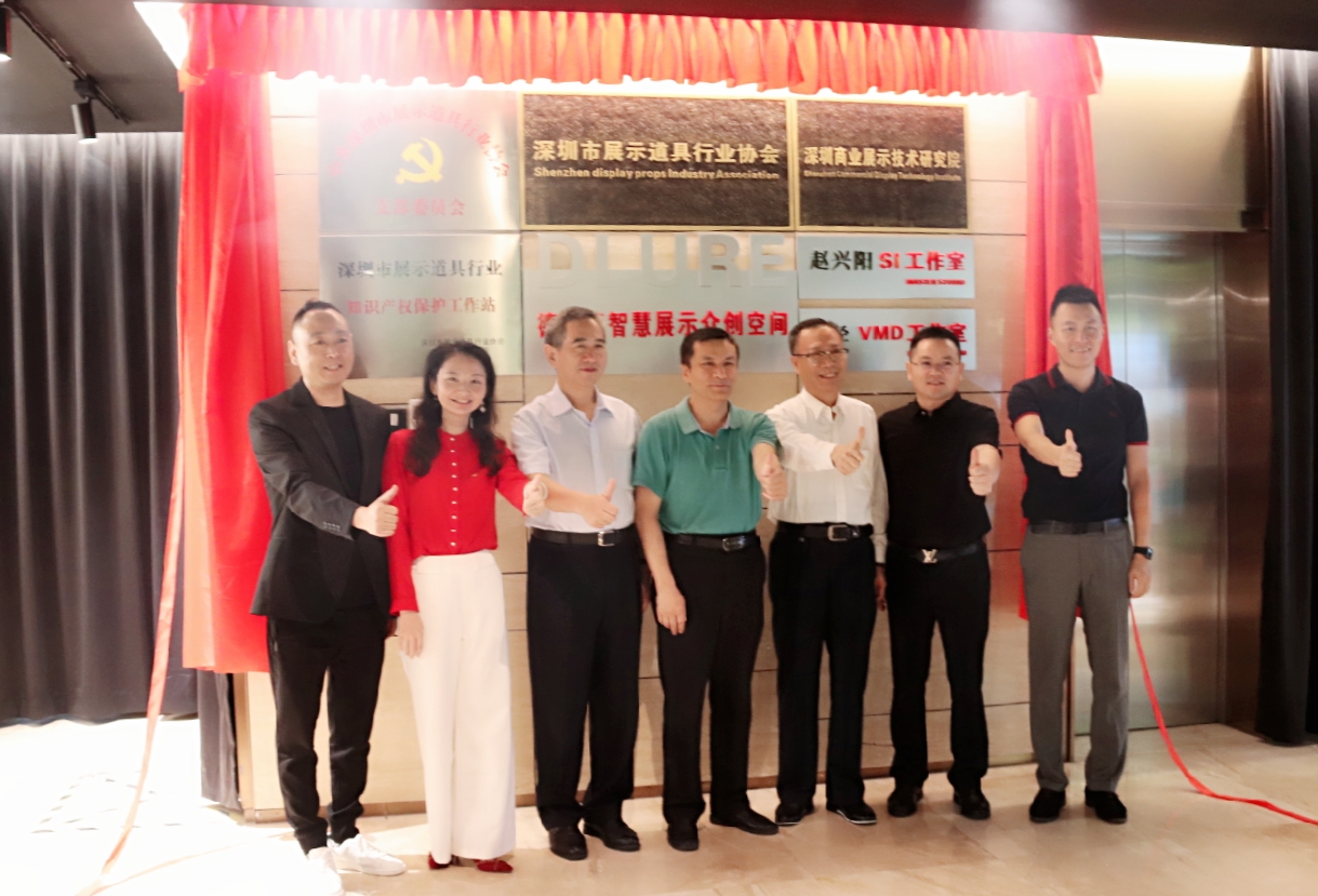 大浪時尚小鎮(zhèn)黨委第一書記劉繼琴、深圳市社會組織管理局副局長孫景明、大浪時尚小鎮(zhèn)建設(shè)管理中心主任曹宇昕、大浪時尚小鎮(zhèn)黨委專職副書記曾鳳,市政協(xié)委員、原市民政局處長駱冰,卡爾丹頓服飾股份有限公司品牌總監(jiān)胡屹,市展示道具行業(yè)協(xié)會創(chuàng)會會長駱詩學(xué),商業(yè)展示技術(shù)研究院、展示道具行業(yè)協(xié)會秘書長蘇建東,共同為商業(yè)展示總部基地揭牌。