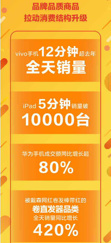 作為傳統(tǒng)優(yōu)勢(shì)品類(lèi),手機(jī)在今年618年中購(gòu)物節(jié)首日的表現(xiàn)仍舊搶眼。vivo手機(jī)12分鐘超去年全天銷(xiāo)量,最終全天的銷(xiāo)量達(dá)到去年同期的11倍;華為手機(jī)成交額同比增長(zhǎng)超80%,華為手機(jī)配件成交額同比增長(zhǎng)超300%; iPad在5分鐘的銷(xiāo)量就突破萬(wàn)臺(tái)。