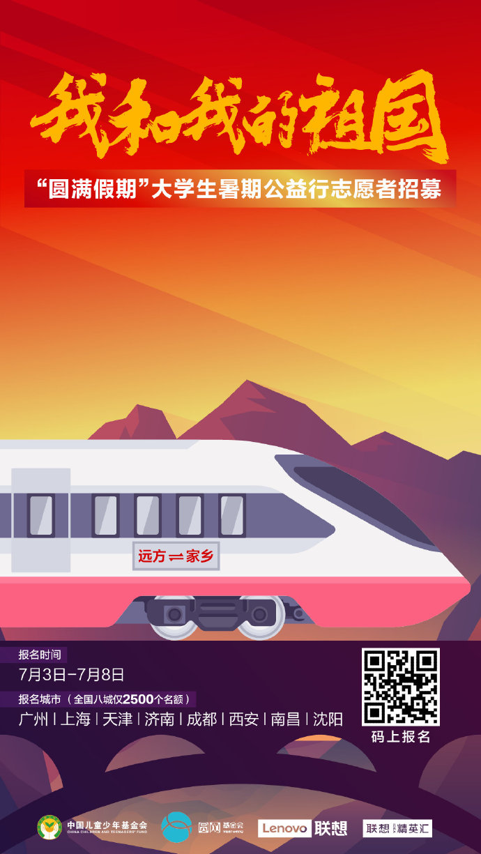 7月3日,由中國兒童少年基金會(huì)、北京圓網(wǎng)慈善基金會(huì)和聯(lián)想集團(tuán)共同發(fā)起的“‘我和我的祖國’圓計(jì)劃—圓滿假期大學(xué)生暑期公益行”活動(dòng),面向全國8個(gè)城市的大學(xué)生正式開啟志愿者招募,邀請(qǐng)回鄉(xiāng)大學(xué)生加入到為廣大留守兒童群體量身定制的公益行動(dòng)中,幫孩子團(tuán)圓、為孩子圓夢(mèng)、讓愛心圓滿。對(duì)于大學(xué)生來說,這將是一次獨(dú)特的公益實(shí)踐經(jīng)歷。