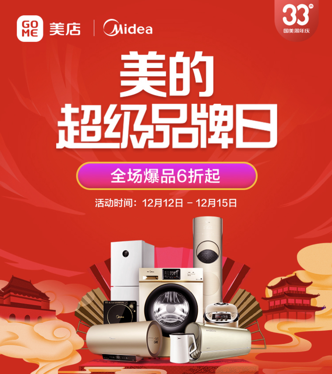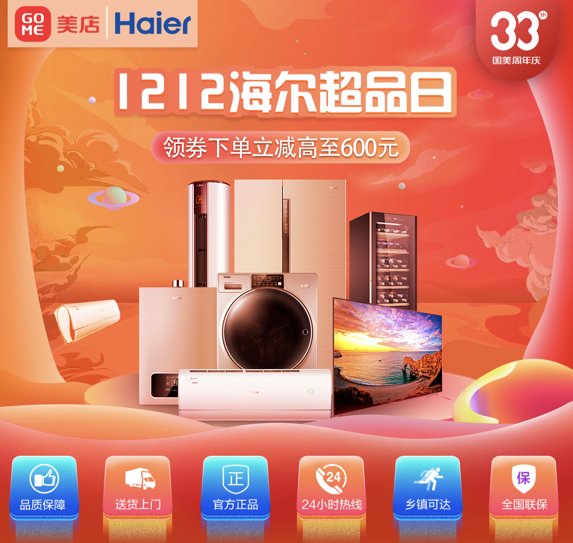 12月12日-15日,33周年生日之際,國美與海爾再度攜手,國美美店帶來海爾超級品牌日活動,涵蓋了海爾冰箱、洗衣機(jī)、空調(diào)、電視、廚房衛(wèi)浴等多個品類豐富產(chǎn)品,多重優(yōu)惠福利、六大承諾保障、延保清洗服務(wù)。