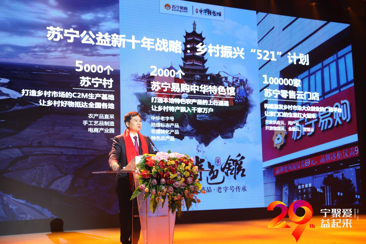 就在12月26日舉行的“蘇寧29周年公益慶生儀式暨新十年公益戰(zhàn)略發(fā)布會”上,蘇寧控股集團董事長張近東發(fā)布了蘇寧鄉(xiāng)村振興“521計劃”,中華特色館是其中重要部分,未來十年要達(dá)到2000個。同時,蘇寧村將會建設(shè)至5000個,蘇寧易購零售云門店則將要開到10萬家。張近東表示,“521”取自三個目標(biāo)的首個數(shù)字,同時也寄托著著蘇寧幫扶鄉(xiāng)村、振興鄉(xiāng)村的深切感情。