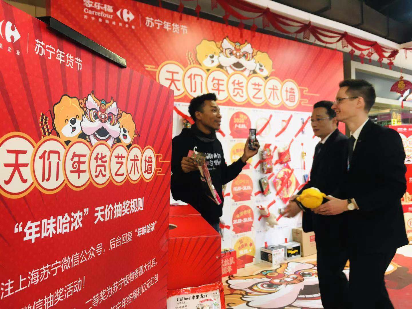 1月10日上午,記者來到家樂福“年味哈濃”天價年貨藝術(shù)墻的活動現(xiàn)場,眾多市民正想躍躍欲試。記者發(fā)現(xiàn),在天價年貨藝術(shù)墻上,有儂好2020、新年快落、腔調(diào)哈濃、年貨老嗲、“鼠”儂最美五類天價年貨。