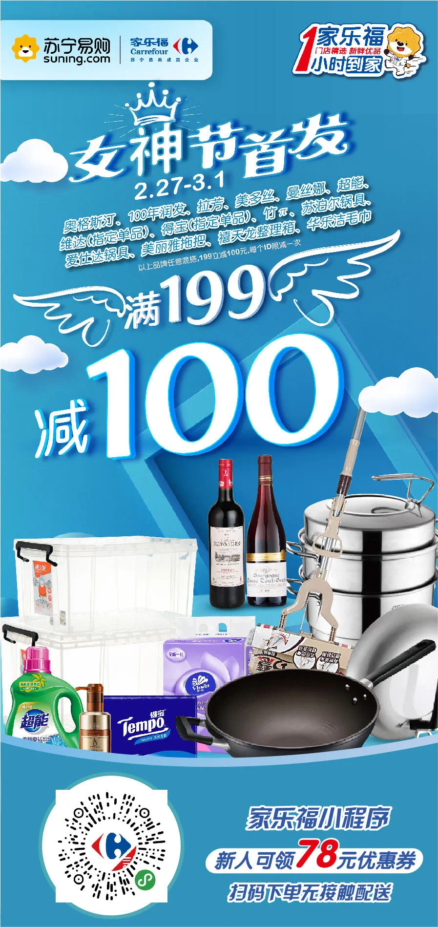 2月27日至3月1日,在家樂(lè)福小程序購(gòu)買奧格斯汀、100年潤(rùn)發(fā)、拉芳、美多絲、曼絲娜、超能、維達(dá)(指定單品)、得寶(指定單品)、蘇泊爾鍋具、愛(ài)仕達(dá)鍋具、美麗雅拖把等非食品類指定品牌滿199立減100元。