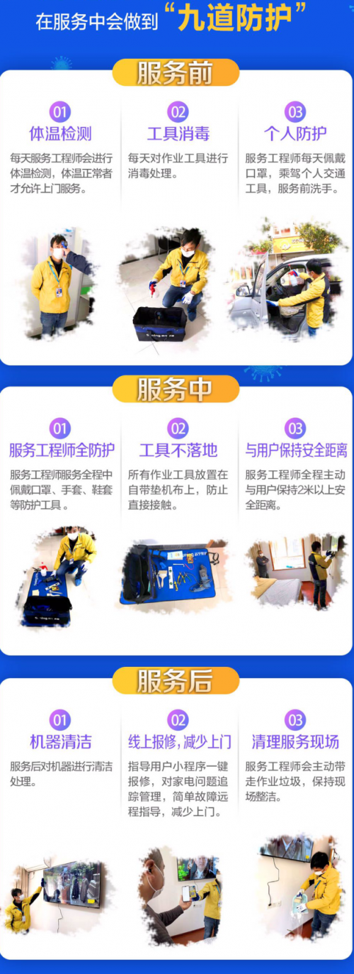 服務(wù)體驗一直以來都是家電行業(yè)的重頭戲,現(xiàn)在正處于疫情特殊時期,蘇寧第一時間做出應(yīng)對之策,為避免人際接觸帶來的潛在感染風(fēng)險,蘇寧幫客全面升級“安心服務(wù)“,發(fā)布九道防護(hù)。據(jù)防護(hù)細(xì)則,蘇寧幫客每名工程師服務(wù)前會經(jīng)過體溫檢測、工具消毒、個人防護(hù)三道工序,服務(wù)中將做到工程師全防護(hù)、工具不落地、并與用戶保持安全距離,服務(wù)后將對家電進(jìn)行清潔,并帶走作業(yè)垃圾。據(jù)了解,目前,“九道防護(hù)”已經(jīng)全面覆蓋家電、家居、家裝的安裝、維修等方面,蘇寧的面面俱到將守護(hù)用戶的健康做到了極致。(吳艷 通訊員黃敏君)
