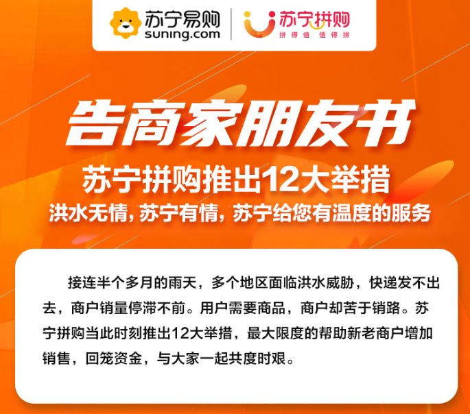 為了更好的幫助全國受汛情影響的農(nóng)民搶銷農(nóng)產(chǎn)品,蘇寧拼購發(fā)布了“戰(zhàn)汛十二條”的具體舉措,分為四大扶助方向: