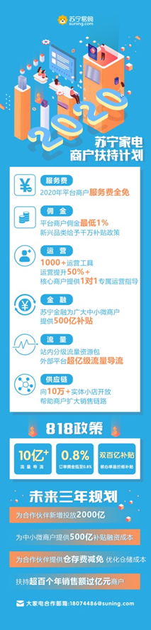 蘇寧宣布,2020年蘇寧將免收平臺商戶服務費;平臺上的商品供應鏈會向蘇寧生態(tài)中10萬+實體小店開放,幫助商戶擴大銷售通路。同時,大家電行業(yè)線將持續(xù)給平臺商戶匹配站內(nèi)外的億級流量,并通過星河生態(tài)賦能平臺開放1000+運營工具,針對核心商戶提供1對1專屬運營指導,借此幫助商戶有效提升經(jīng)營效率,降低運營成本。818期間,平臺訂單傭金從最低1%降至0.8%,針對核心單品提供雙百億補貼,且向平臺商戶給予10億+的流量導流扶持,幫助商戶全面應戰(zhàn)818。