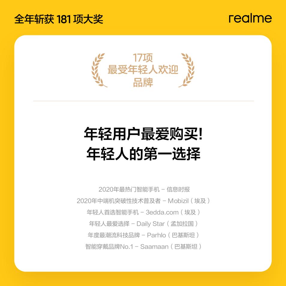 自創(chuàng)立以來,realme一直面向年輕用戶群體,基于對(duì)年輕人審美與偏好的精準(zhǔn)洞察與理解,不斷滿足和超越年輕科技愛好者的需求,這一策略在東南亞、南亞、歐洲、非洲等市場(chǎng)獲得極大認(rèn)可。2020年,全球給予realme“年輕人最喜愛品牌”等相關(guān)獎(jiǎng)項(xiàng)達(dá)17項(xiàng),用實(shí)力證明realme是“年輕人第一選擇”。同時(shí),realme一舉網(wǎng)羅全球各大產(chǎn)品獎(jiǎng)項(xiàng),充分證實(shí)了“好產(chǎn)品會(huì)說話,產(chǎn)品才是硬實(shí)力”這句被商界奉為圭臬的卓見。