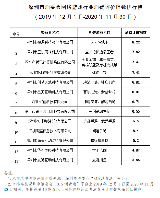為推進(jìn)網(wǎng)絡(luò)游戲消費者權(quán)益保護(hù)工作,促進(jìn)網(wǎng)絡(luò)游戲行業(yè)規(guī)范發(fā)展,引導(dǎo)放心消費,深圳市消委會依據(jù)2019年12月1日至2020年11月30日期間的相關(guān)數(shù)據(jù),對注冊所在地為深圳的年投訴量10宗及以上的13家網(wǎng)絡(luò)游戲經(jīng)營者進(jìn)行消費評價指數(shù)排名。