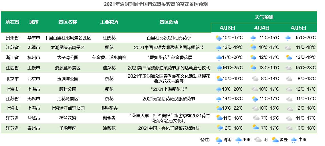 預(yù)計(jì)清明假期杭州西湖風(fēng)景名勝區(qū)最為熱門,其次為太子灣公園、太湖黿頭渚風(fēng)景區(qū)、古雞鳴寺、中國百里杜鵑風(fēng)景名勝區(qū)、顧村公園、天安門、廣州塔、五臺山風(fēng)景名勝區(qū)、西安鐘樓。