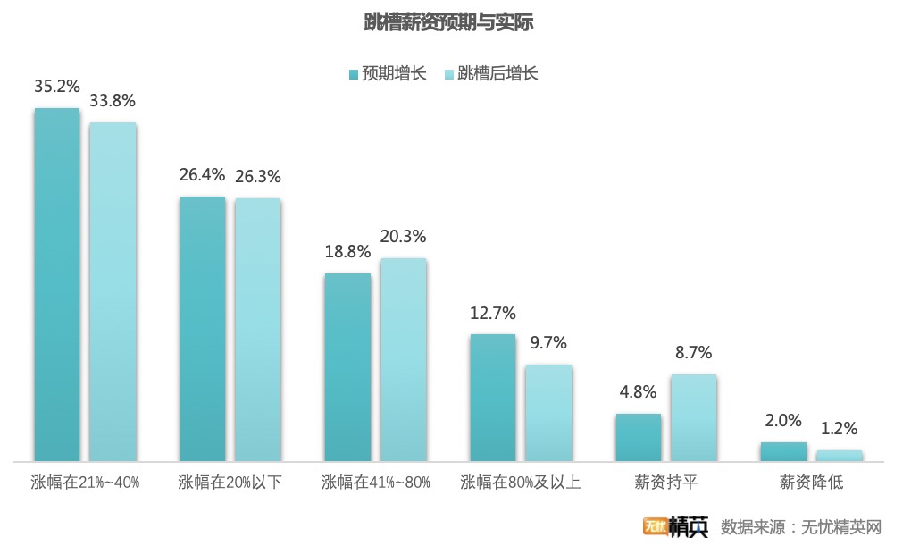 同時(shí)經(jīng)歷了一年的觀望、沉淀,職場精英在求職時(shí)不論是對(duì)工作城市、崗位還是薪資預(yù)期也更加理性。在兩組調(diào)研數(shù)據(jù)中,我們不難發(fā)現(xiàn)此次跳槽多數(shù)職場精英的薪資漲幅在21-40%之間,預(yù)期與實(shí)際增長之差僅有約3個(gè)百分點(diǎn)。這表明在職場精英對(duì)個(gè)人情況與行業(yè)崗位現(xiàn)狀做詳盡調(diào)查,預(yù)期管理科學(xué)合理。