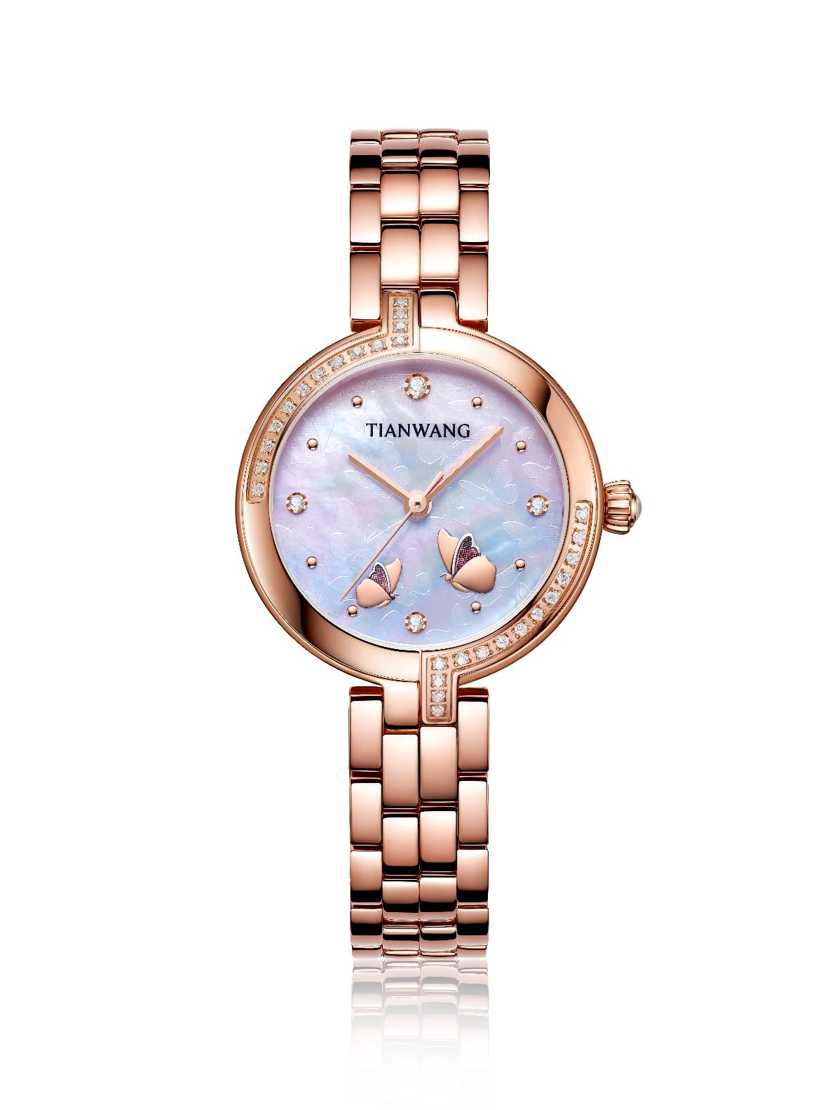 這次合作的腕表,沿襲了天王表的精品品質(zhì)和設(shè)計美學(xué),有點(diǎn)“小確幸”的風(fēng)格,整體很秀氣但是細(xì)節(jié)都誠意滿滿。表是蝴蝶的天空,指針是蝴蝶的舞步。表盤采用蝴蝶壓印貝母,在藍(lán)寶石玻璃表鏡下,兩只立體蝴蝶翩然起舞,人如蝴蝶,蝴蝶像人,都迷戀這花花世界,想要縱情暢游其中。腕表刻度和表圈由璀璨皓石點(diǎn)綴,3點(diǎn)、6點(diǎn)、9點(diǎn)、12點(diǎn)使用較大皓石,使得整個表盤錯落有致,富有層次感。搭配夢幻南瓜把的,極具浪漫色彩。玫瑰金色不銹鋼表殼,給人以優(yōu)雅炫目之感,質(zhì)感鋼帶,光澤度明亮,搭配不銹鋼蝴蝶扣,錦上添花,佩戴效果自然舒適。