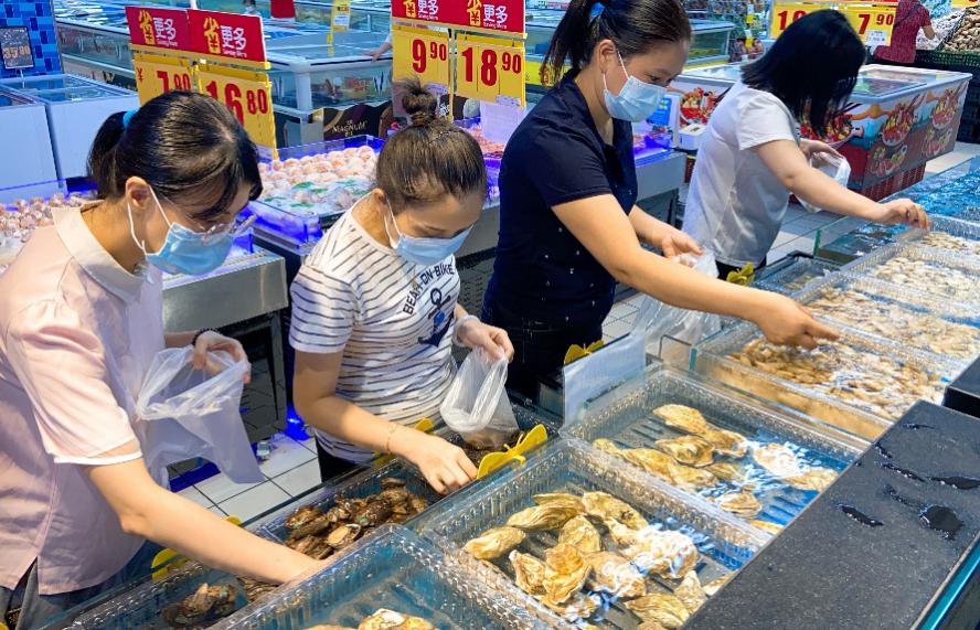 今日早晨,在家樂福深圳紅寶店,來自福建寧德、山東青島、浙江舟山、廣西北海、廣東珠海等地的鮮活生蠔、大閘蟹、基圍蝦、珍寶蟹、皮皮蝦、多寶魚等各類國產(chǎn)鮮活水產(chǎn)和來自俄羅斯的帝王蟹,英國的面包蟹,美國的珍寶蟹等各類進口鮮活海鮮呈現(xiàn)在消費者面前,讓早市搶購的顧客躍躍欲試。