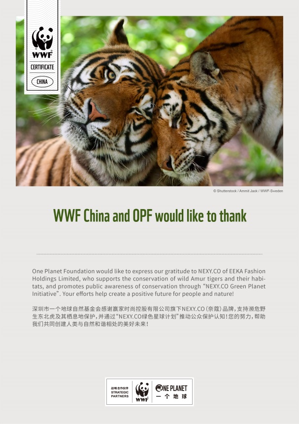 2021年,NEXY.CO攜手WWF(世界自然基金會)和OPF(一個地球自然基金會)共同推出2021SS 【綠色星球】公益環(huán)保系列,踏出了綠色環(huán)保公益的關(guān)鍵一步。 NEXY.CO通過WWF和OPF,特別捐贈款項用于支持野生東北虎及其棲息地的專項保護,呼吁大家關(guān)注瀕危野生動物及其棲息地保護,喚醒人們對自然的關(guān)愛。