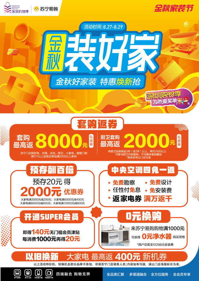 而9月9日到9月12日期間,蘇寧易購將開啟涉及全品類的金秋家裝節(jié),并且將會聯(lián)合海信一起開啟909嗨購盛典,屆時(shí)不僅會有大牌匯聚,福利補(bǔ)貼,還將會有家裝品牌共同加入,聯(lián)手提供一站式裝修解決方案,一同為消費(fèi)者避開家裝過程中的那些坑。同時(shí)深圳購物季也在持續(xù)進(jìn)行中,蘇寧易購作為指定電商平臺,為深圳市提供了一億元的消費(fèi)補(bǔ)貼,消費(fèi)者在深圳市蘇寧易購門店參與以舊換新活動,大家電產(chǎn)品最高可以補(bǔ)貼400元,手機(jī)產(chǎn)品最高可以補(bǔ)貼1600元,電腦產(chǎn)品最高享受88折優(yōu)惠。另外蘇寧易購還開設(shè)了“圳品專區(qū)”,里面匯聚深圳本土大牌產(chǎn)品,折扣低至五折起。