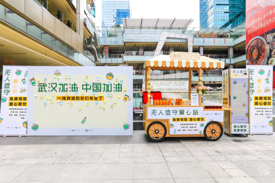 3月3日至3月8日卓悅INTOWN在街頭專設(shè)了一個”無人值守愛心站”,用愛心餐車上放滿了食物冷/熱飲,專門免費(fèi)贈送給快遞、外賣小哥、環(huán)衛(wèi)工人、警察、城管等一線奔波的人員。