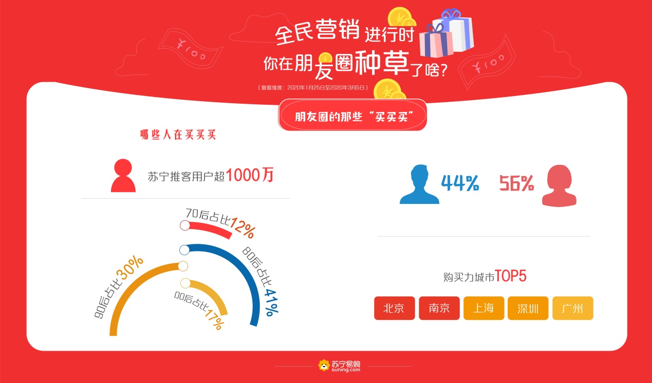 近日,蘇寧易購發(fā)布全民營銷大數(shù)據(jù),2020年1月25日至3月5日,蘇寧推客買家數(shù)和賣家數(shù)分別突破千萬、百萬大關(guān),80后成為朋友圈買、賣“雙主力”,糧油休食、個護(hù)家清、生鮮等產(chǎn)品成為最受歡迎的消費(fèi)品類。