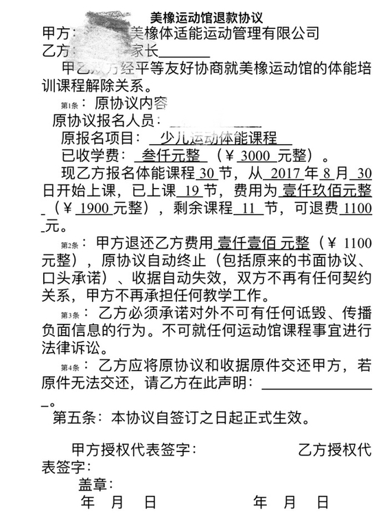 我于2017年8月30日續(xù)報深圳市美橡體適能運動管理有限公司體能課程,已經(jīng)是第三次報了,每次3000元,30節(jié)課,都是與教練微信溝通與轉帳。2018年1月10日收到該公司通知說結束體能館的業(yè)務,不再營業(yè),說統(tǒng)一給我們退剩余的課程費用,12號加了該公司財務微信溝通相關退費事宜,財務說統(tǒng)計好在一周內(nèi)統(tǒng)一給我們退費,19號收到財務信息,說可以退回1100元,還說幾天后可以退款,并說好通過微信退還(當時壓根沒有說簽協(xié)議后再退),一周拖一周,在23號忽然發(fā)微信來通知說要求去簽協(xié)議才退款,當天又進行了協(xié)商,因為我?guī)z小孩實在抽不出時間去他們公司,能否把協(xié)議發(fā)到我郵箱確認,財務說先與他老板匯報后第二天給回復,但第二天也沒有收到任何回復,然后又問財務協(xié)議發(fā)過來了嗎?財務二話沒說就把協(xié)議通過微信發(fā)給我,當時想想簽了就算了,但細看第三、四條真的很難讓人接受,內(nèi)容詳見附件1。我們交費的時候什么協(xié)議、收據(jù)對方都沒給,現(xiàn)在退錢就要求我們簽協(xié)議,而且是霸王條款,還叫我寫上“我自愿終止培訓課程”,老天哪是我自愿的,真是有種迫良為猖的感覺,還有第三條,也太污辱人格了,再次和他們友好協(xié)商希望把協(xié)議第三條改了,對方視而不見,不理不睬,也不積極回應。