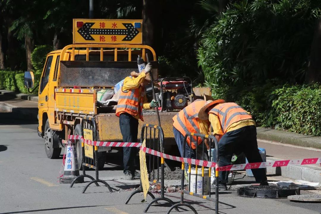 水務(wù)部門工作人員在瀾景路上對路面的破損井蓋進(jìn)行更換。