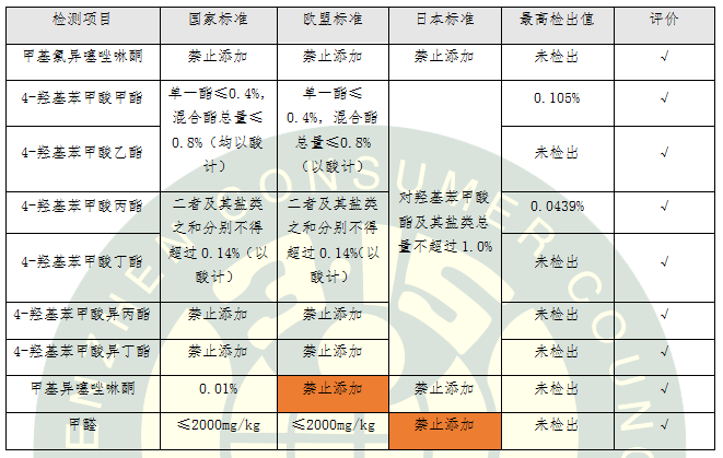 表3.不同國家地區(qū)防腐劑標(biāo)準(zhǔn)要求比對及評價(jià)結(jié)果