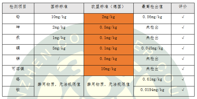 由于配方用料的特殊性,粉底類產(chǎn)品要比普通的面霜和乳液更容易受到重金屬的污染。因此,本次比較試驗(yàn)不僅檢測國標(biāo)要求的鉛、砷、汞、鎘,歐盟額外要求的銻和可溶鎳,還檢測了我國和歐盟均禁用的鉻和釹,并且,6種有限量要求的重金屬均按照最嚴(yán)格的德國標(biāo)準(zhǔn)進(jìn)行評價(jià)。