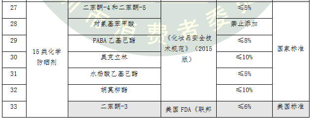防曬化妝品在美國按非處方藥(OTC)管理,新的防曬劑當(dāng)作新藥品來批準(zhǔn),審評要求非常嚴(yán)格。本次比較試驗(yàn)測試的15類化學(xué)防曬劑按照國標(biāo)、歐標(biāo)和美標(biāo)中最嚴(yán)格的標(biāo)準(zhǔn)進(jìn)行評價(jià)。我國允許使用的5類化學(xué)防曬劑在美國被禁止使用,還有4類化學(xué)防曬劑在美國的限量要求更加嚴(yán)格。
