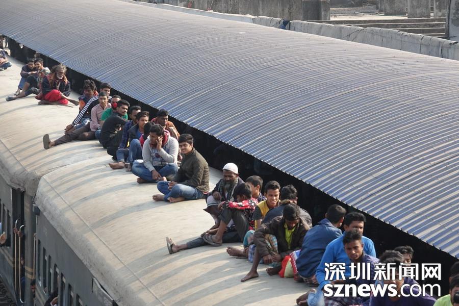 從達(dá)卡到邁門辛的火車是國內(nèi)最擁擠的線路之一,通常有數(shù)千名旅客擠在載客人數(shù)只有650人的火車?yán)?,有的抓著把手,有的蹲在門口,要不就蹲在車箱間的聯(lián)軸上或坐在車頂上。李仁奇攝