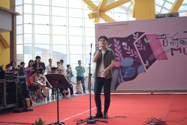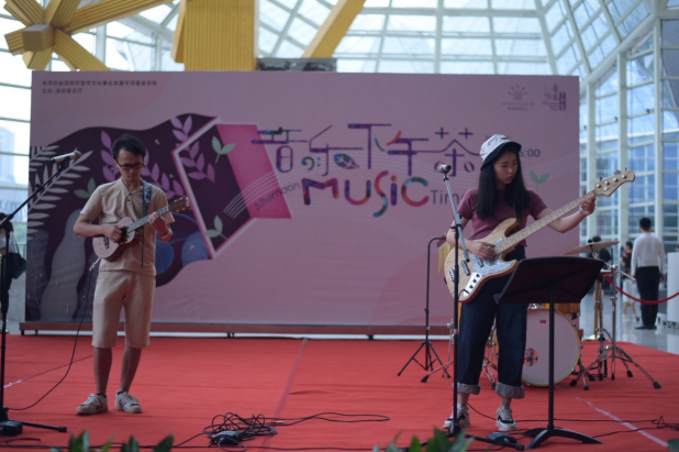 畢業(yè)于深圳大學(xué)金鐘音樂學(xué)院的主唱周鈺城帶來兩首尤克里里樂隊歌曲, Jason Mraz 的經(jīng)典曲目《 I’ m Yours 》和英國當(dāng)紅歌星 E d sheeran 的 《 Thinking out Loud 》,周鈺城富有磁性的嗓音,在深圳夏威夷小吉他協(xié)會理事謝佳宜的尤克里里琴聲以及同樣畢業(yè)于深圳大學(xué)金鐘音樂學(xué)院的鼓手黃曉輝的鼓聲伴奏中,美妙的融合在一起。