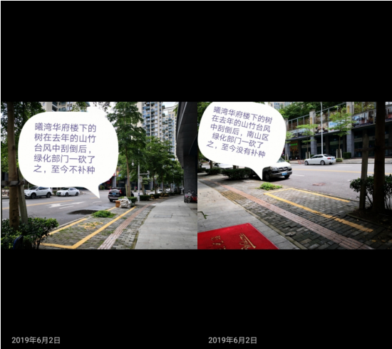 “南山區(qū)城管局當(dāng)時(shí)回應(yīng)道:‘因臺(tái)風(fēng)砍倒的樹木將會(huì)統(tǒng)一采購,盡快予以補(bǔ)種;有問題的路牌將于七月底前更換。會(huì)盡快聯(lián)系南山稅務(wù)部門,修復(fù)有問題的井蓋’”,該市民卻對(duì)管理部門的工作效率提出質(zhì)疑:“然而現(xiàn)在距離投訴已經(jīng)兩個(gè)月了,問題依然存在。工作效率如此之低?”
