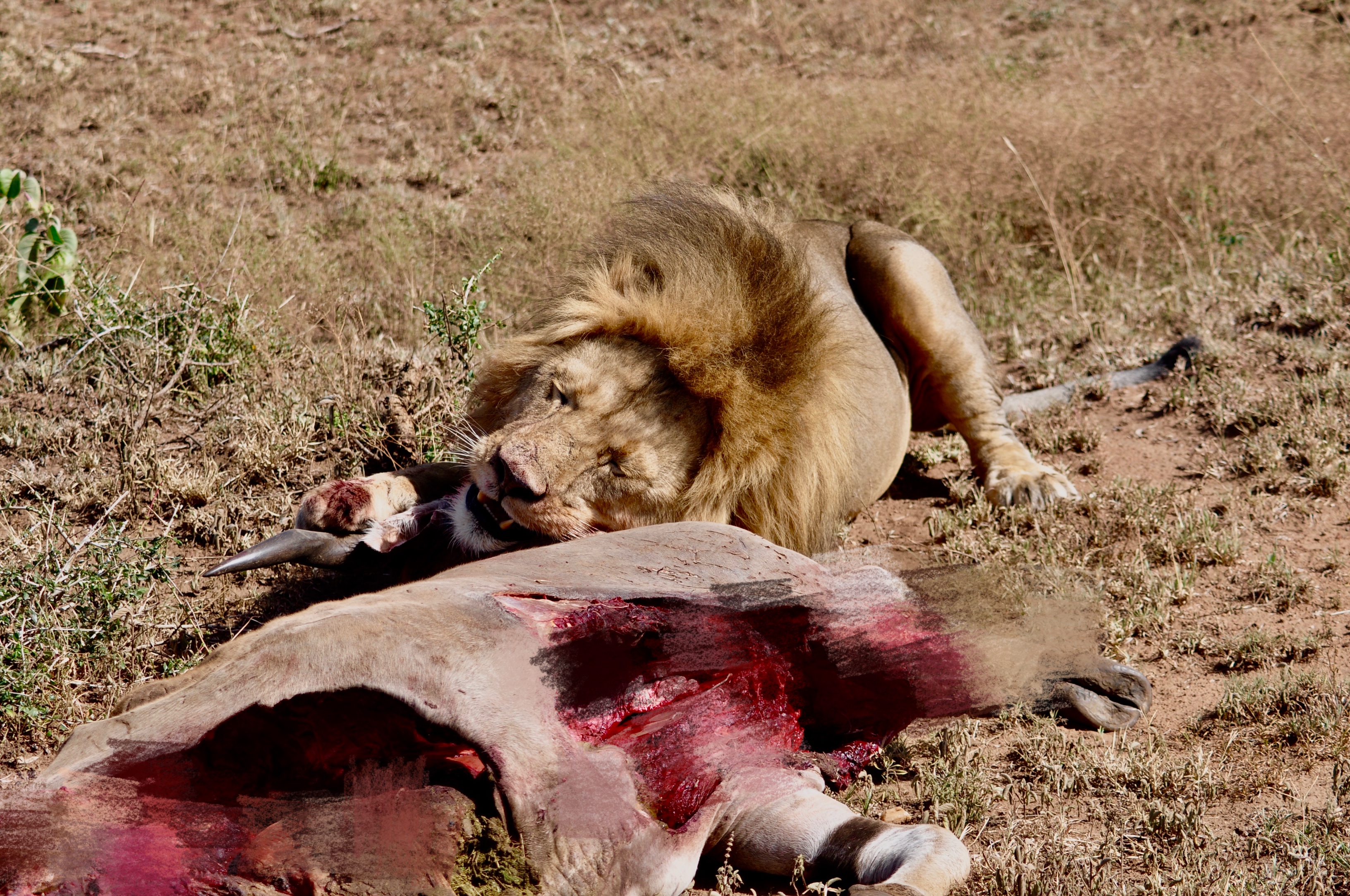 游客們在距雄獅三、五米的車上從容地拍攝了二十多分鐘,記錄下了叢林法則下這場血腥饕餮大餐的全過程。