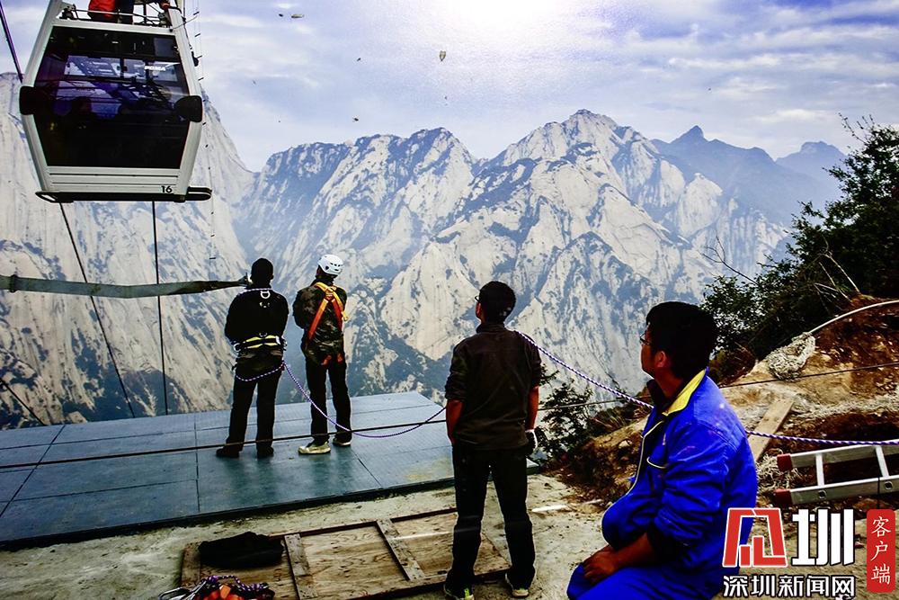 華山西峰的太華索道是迄今為止世界上第一條采取崖壁開鑿硐室站房、兩上兩下的起伏式走向、設(shè)中間站的單線循環(huán)脫掛式索道,總計(jì)投資5億余元建設(shè)。李酮攝。