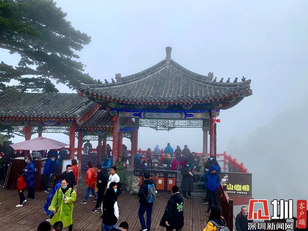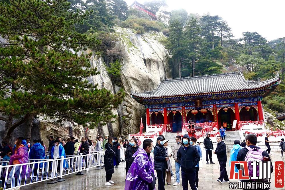 共有72個(gè)半懸空洞,道觀20余座,其中玉泉院、都龍廟、東道院、鎮(zhèn)岳宮被列為全國重點(diǎn)道教宮觀,有陳摶、郝大通、賀元希等著名的道教高人。排隊(duì)等待參觀的游客。李仁奇攝。